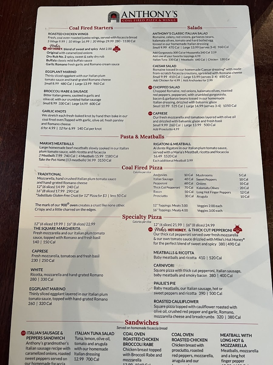 Apart from the pizzas and wings, Anthony's offers an array of starters and salads to begin your meal. Indulge in the Classic Italian Salad brimming with fresh ingredients or enjoy the crispy Garlic Knots, perfect for sharing—or not! The pasta options, such as the Rigatoni & Meatball served with a rich tomato sauce and homemade focaccia, showcase the restaurant's commitment to hearty and satisfying dishes.